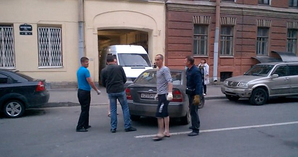 战斗民族的力量:俄五男子合力抬走占道轿车(图)