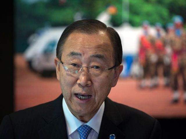 6月1日,美国纽约,联合国秘书长潘基文发表讲话,强烈谴责驻马里维和人员遇袭。(新华社记者李木子摄)