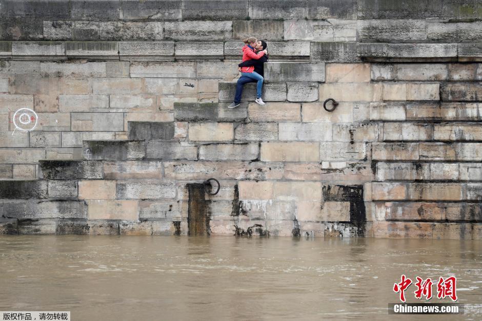 法国巴黎的一对恋人完全不在意脚下蔓延的塞纳河水,他们忘我的拥吻,向世人宣告,虽然被水淹,但巴黎依然是浪漫之都。