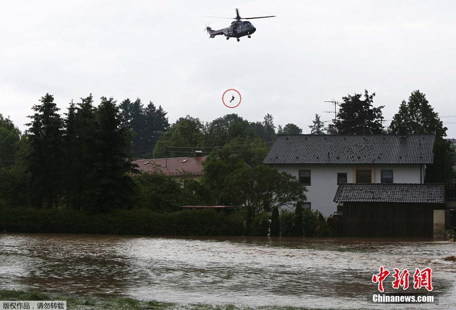 德国也深受洪涝折磨,在慕尼黑东部的巴伐利亚村庄Triftern的营救行动中,出动了直升机,救出一名被洪水围困的居民。