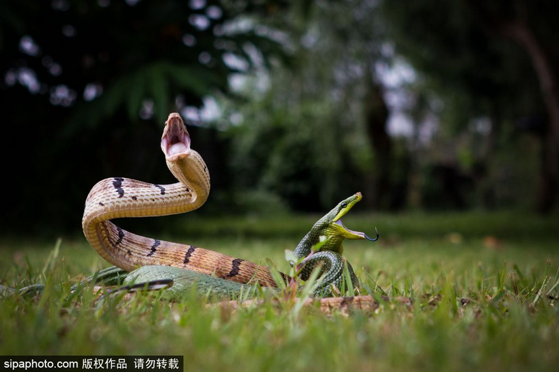 印尼人Krisdian Wardana在自家后院发现两条蛇在打架,便用相机记录下这激烈火爆的场面。一条是红尾绿色食鼠蛇,另一条是三索颌腔蛇。摄影师说这两条蛇可能是因为猎物和领地才大打出手。红尾绿色食鼠蛇常生活树上,很少下地面来。而另外一条棕色的蛇天生具有攻击性。Sipaphoto