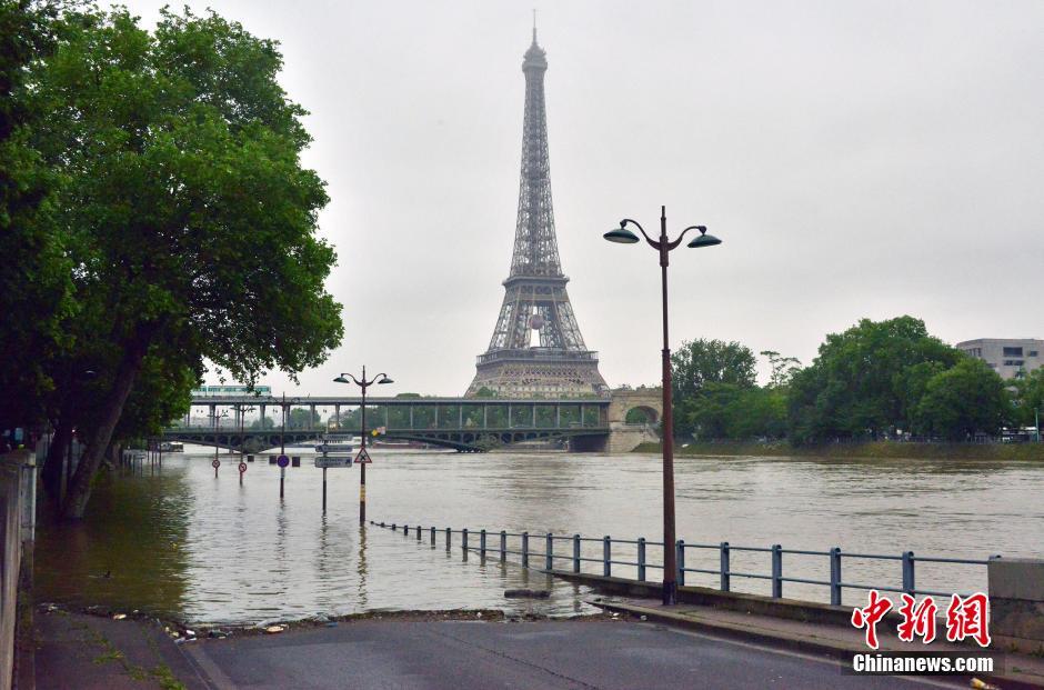 由于多日来持续的降雨天气,法国多地出现水情甚至洪涝灾害,首都巴黎塞纳河水位不断上涨,目前已经亮起橙色预警,预计3日将达到6米峰值。塞纳河水位升高造成大巴黎地区多条远郊铁路和城际铁路线路受阻,河畔的卢浮宫和奥赛博物馆将于3日关闭,以采取预防洪涝的措施。图为巴黎市内塞纳河水已漫溢至岸边路面。 中新社记者 龙剑武 摄