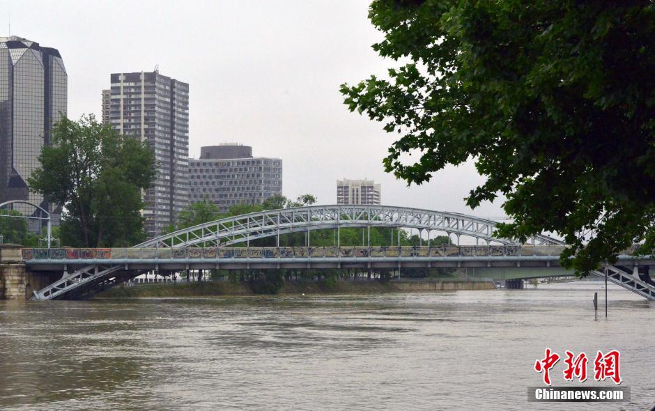 由于多日来持续的降雨天气,法国多地出现水情甚至洪涝灾害,首都巴黎塞纳河水位不断上涨,目前已经亮起橙色预警,预计3日将达到6米峰值。塞纳河水位升高造成大巴黎地区多条远郊铁路和城际铁路线路受阻,河畔的卢浮宫和奥赛博物馆将于3日关闭,以采取预防洪涝的措施。图为巴黎市内塞纳河水已淹没一座桥梁的大部分桥墩。 中新社记者 龙剑武 摄