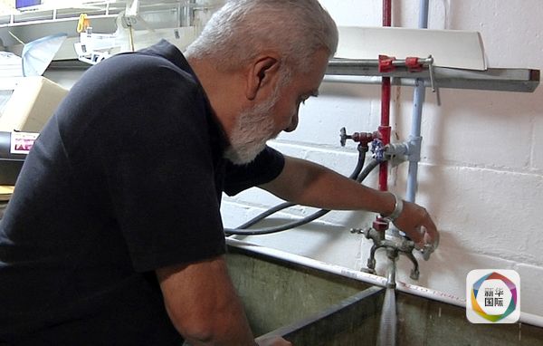 5月24日电视截图显示:弗林特市居民拧开家中地下室水龙头。(图片来源:新华/美联)
