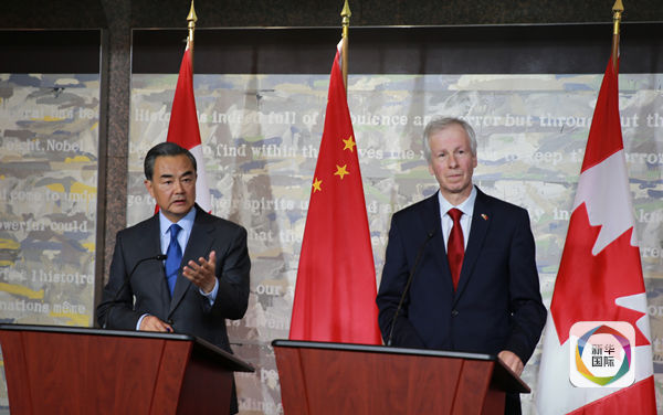 中国外长王毅1日在加拿大首都渥太华与加拿大外长迪翁举行了首次中加外长年度会晤后,当地时间当天下午2时30分左右,与迪翁一起在加拿大外交部大楼一楼大厅举行联合新闻发布会。