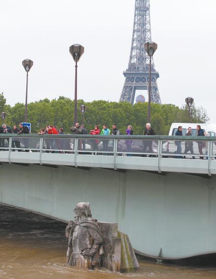 记者在巴黎看到,塞纳河水位3日大幅上涨,巴黎市内的各座桥梁的桥洞很多已被洪水吞没。塞纳河畔的地铁快线C线已经关闭,其他地铁也相应受到影响。塞纳河畔平时供游人散步的河滨道大都遭到水淹,已经浸入水下。塞纳河游船也几乎全线停开。阿尔玛桥下著名的朱阿夫士兵雕像是衡量塞纳河水位的最佳标志:一旦水位涨到朱阿夫的脚面,意味着塞纳河就要发大水了。1910年大洪水时,水淹到了雕像的肩膀。后来人们将这一雕像的底座提高了一些,3日早上,水淹到雕像的小腿,到当天下午,已经淹到了大腿。