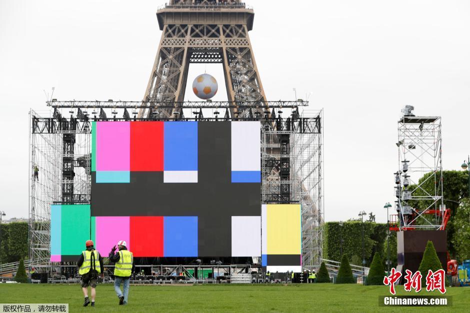 2016年欧洲杯开赛在即 埃菲尔铁塔挂“足球”装饰