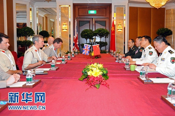 6月5日,中央军委联合参谋部副参谋长孙建国(右二)在新加坡会见英国国防参谋长霍顿(左二)。新华社发(邓智炜摄)