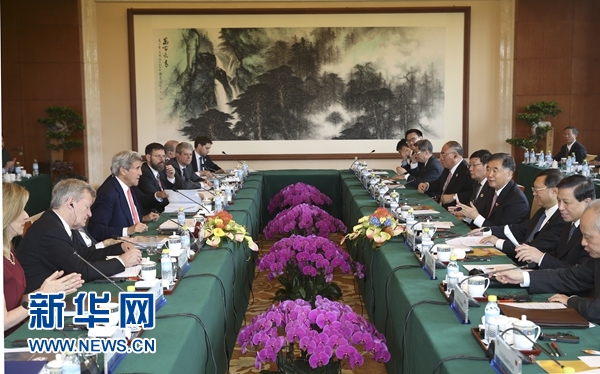 6月6日,第八轮中美战略与经济对话气候变化问题特别联合会议在北京钓鱼台国宾馆举行。中国国家主席习近平特别代表国务院副总理汪洋、国务委员杨洁篪同美国总统奥巴马特别代表国务卿克里、财政部长雅各布·卢共同主持会议。新华社记者 马占成 摄