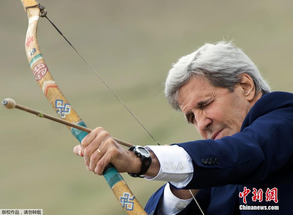 当地时间2016年6月5日,蒙古乌兰巴托,美国国务卿克里出席那达慕大会,学习射箭。