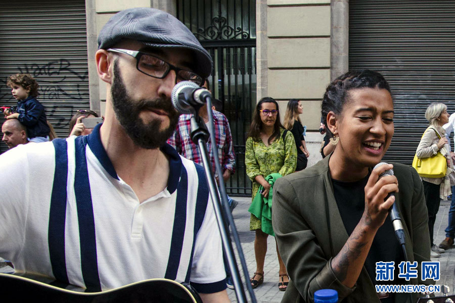 夏日临近,天气渐热,在西班牙巴塞罗那,一些社区机构开始张罗各种街头文化娱乐活动,吸引本地居民走出家门。位于巴塞罗那市中心地带的拓展区于6月3日到5日举办了一年一度的“巴塞罗那现代主义节”。节日期间,主办方临时封闭了社区几条街道,举办包括歌舞、魔术、木偶剧等不同类型的演出,还在街上临时搭建起出售手工艺品的摊位,由身着传统服饰的工作人员向大家介绍文化艺术的相关知识。图为艺人街头献唱。新华网发(贺耀龙摄)