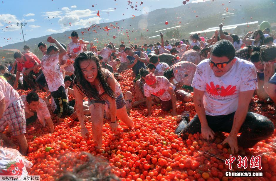 当地时间2016年6月5日,哥伦比亚Sutamarchan,民众参加“番茄大战”。“番茄大战”起源于西班牙的20世纪40年代,关于“番茄大战”的来历,有这样一个传说:有一天,该城一个小乐队从市中心吹着喇叭招摇过市,领头者更是将喇叭翘到了天上。这时,一伙年轻人突发奇想,抓起西红柿向那喇叭筒里扔,并且互相比试,看看谁能把西红柿扔进去。这就是“西红柿大战”的由来。