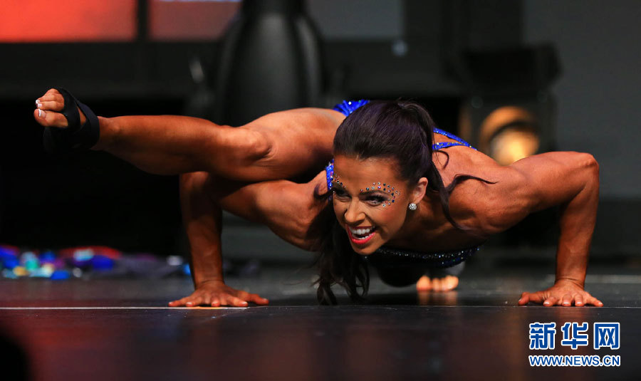 6月4日至5日,国际健美联合会2016年冠军赛在加拿大多伦多举行。比赛中,各国健美女选手将柔美与阳刚融为一体,被观众称为“金刚芭比”。图为一位女选手在比赛中进行技巧展示。新华网发(邹峥摄)