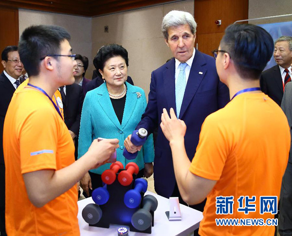 6月7日,中国国务院副总理刘延东与美国国务卿克里在北京共同参观中美青年创客大赛优秀作品展示。 新华社记者 丁海涛 摄