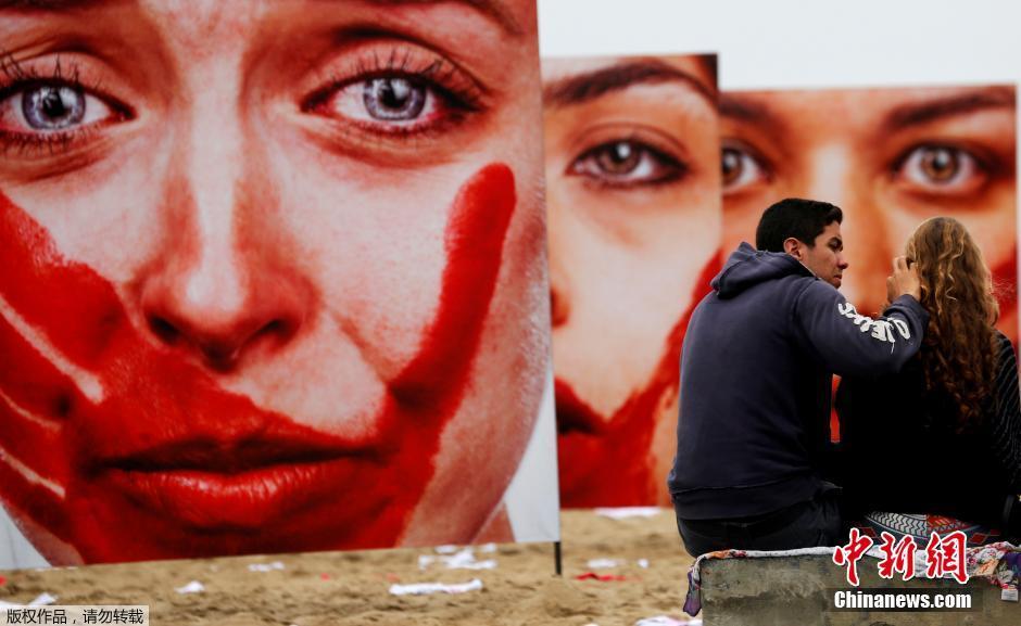 里约海滩竖起巨型照片墙 抗议对女性暴力犯罪(组图)