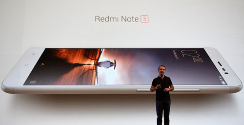 3月3日,在印度首都新德里,小米科技全球副总裁雨果·巴拉在发布会上介绍红米Note 3手机。新华社记者毕晓洋摄