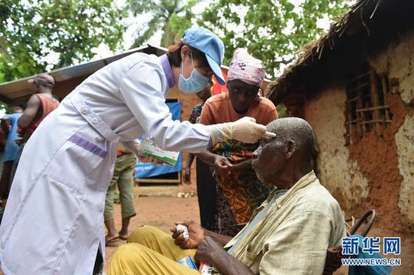 这是2015年11月1日,在利比里亚绥德鲁市附近村庄,中国第18批赴利比里亚维和部队医疗分队护士长李炜为一名当地老人讲解如何用药。 新华社记者 孙瑞博 摄