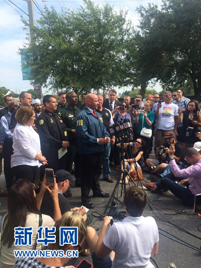 6月12日,在美国佛罗里达州奥兰多市,美国联邦调查局官员就枪击案出席新闻发布会。美国佛罗里达州奥兰多市市长12日宣布,该市当天凌晨发生的夜总会枪击案已致50人死亡、53人受伤。 新华社发(奥兰多警察局供图)