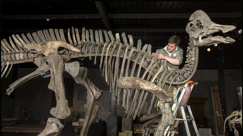 这次拍卖会最主要的拍品是一副7500万年前的鸭嘴龙骨架,有25英尺(7.62米)长、9英尺(2.74米)高,重约4吨。鸭嘴龙生活在白垩纪晚期,据肯特大学的一项研究显示,到10岁左右鸭嘴龙就能长到30英尺(约9.1米),鸭嘴龙的成长速度要比它的捕食者快3至5倍,当它完全长大的时候,和它一样年纪的霸王龙体型还没完全成熟,这是巨大的体型差距,因此鸭嘴龙可以以此稍稍抵挡来自食肉龙的攻击。在分析残骸时,专家测量了这副骨架的生长环,发现它死亡时大约12岁。由于鸭嘴龙生活在6500万年到7500万年以前,因此它很有可能是最后一个灭绝的恐龙物种。这副骨架在90年代于美国蒙大拿被发现,自此后一直保存在荷兰的埃门动物园供展览,它还有个名字叫菲雅(爱神之意)。