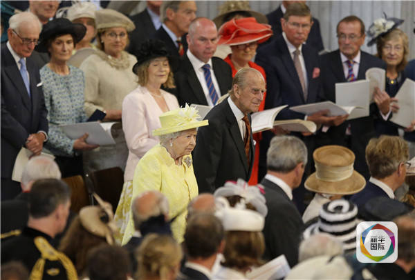 6月10日,在英国伦敦,英国女王伊丽莎白二世和丈夫菲利普亲王在圣保罗大教堂参加全国感恩仪式。(新华社/路透)