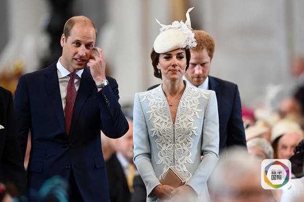 6月10日,在英国伦敦,威廉王子(左)与凯特王妃(前右)抵达圣保罗大教堂准备参加全国感恩仪式。(新华社/美联)