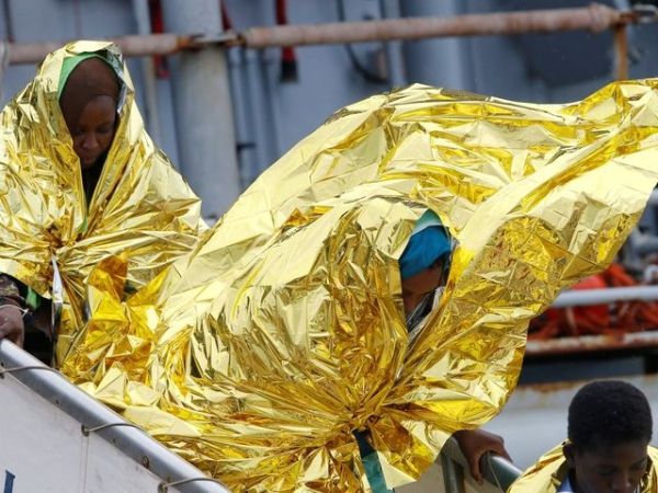 偷渡难民走下救援船。(图片来源:新华/路透)