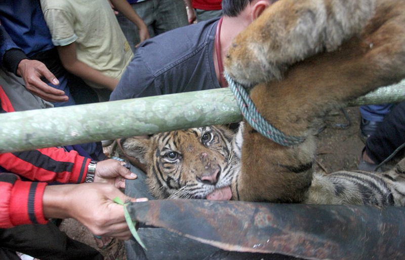 该老虎是一只5岁的苏门答腊母虎。6月10日,当地村民用麻醉飞镖将其射晕。