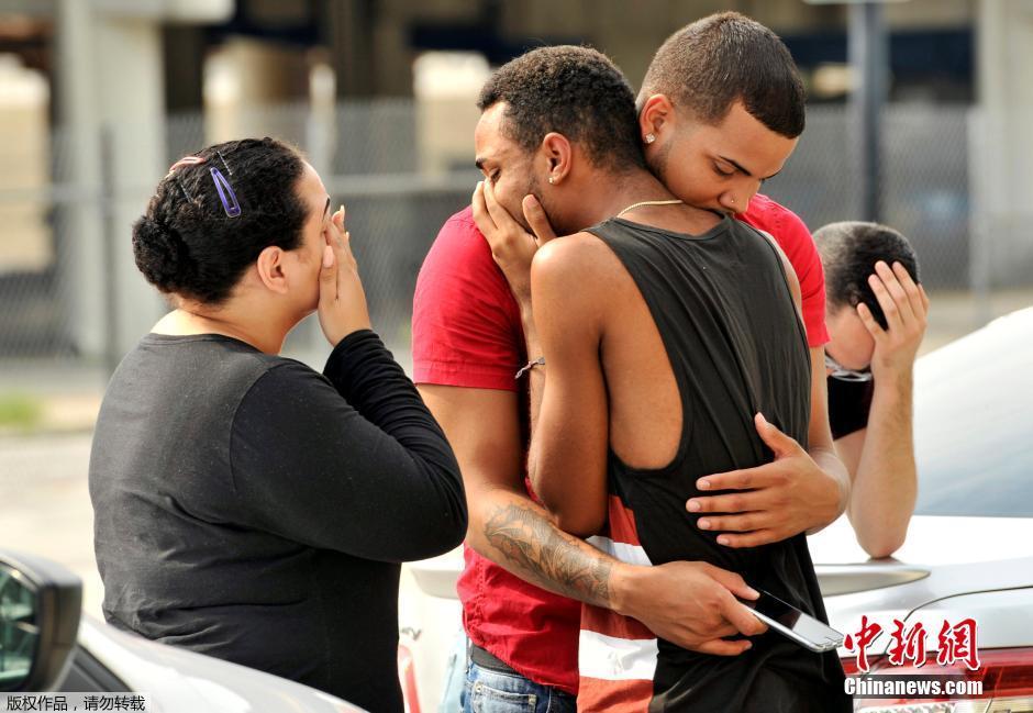 米那表示,凌晨5时左右,特警组冲入夜店内部将枪手击毙,并将人质解救。他表示,一名警察在交火过程中受伤。图为案发后当地民众相互拥抱安慰。