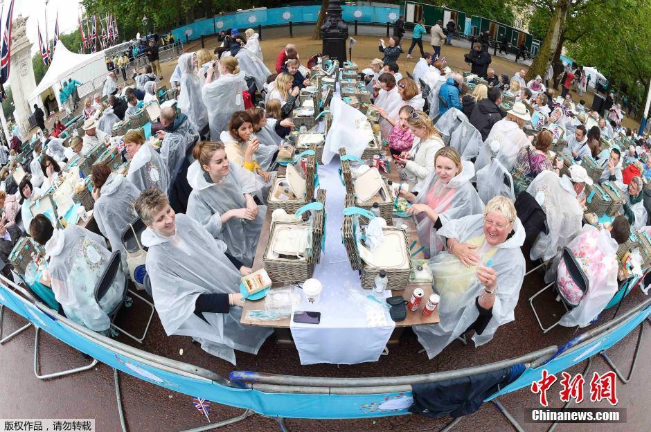 当地时间2016年6月12日,英国伦敦,民众冒雨参加街头午餐派对,庆祝女王90岁生日。