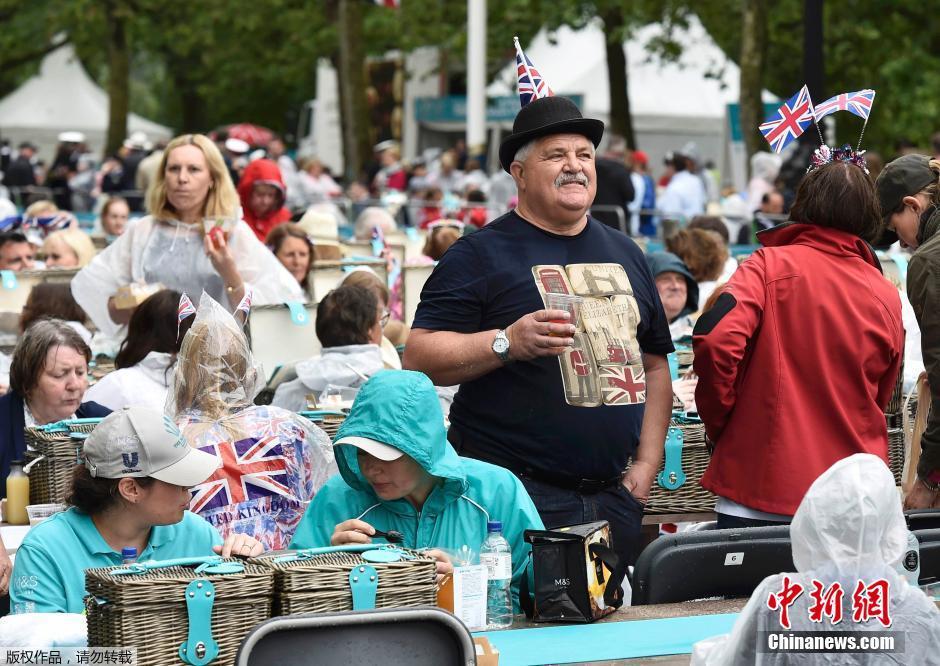 当地时间2016年6月12日,英国伦敦,民众冒雨参加街头午餐派对,庆祝女王90岁生日。