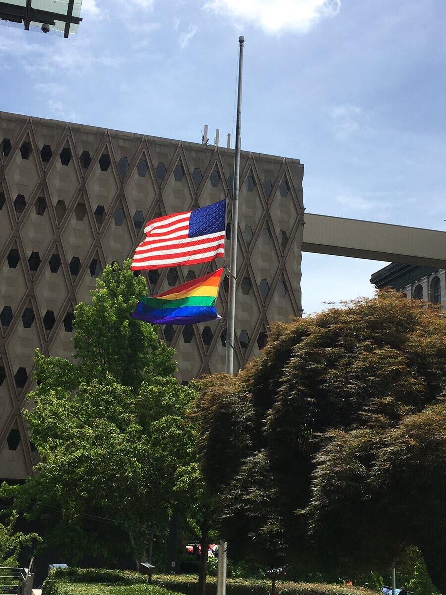 此图为西雅图“KING5”媒体的一名记者在其个人“推特”上发布的,美国西雅图市政府外美国国旗与彩虹旗同降半旗。