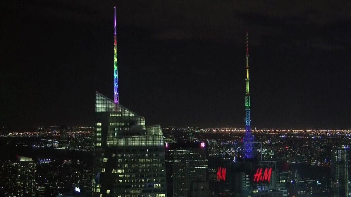 美国银行大楼,以及时代广场同样点亮了彩虹灯。