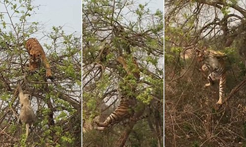 母猴利用树枝掩护,不断晃来晃去,结果,老虎显然无法有效在树上保持平衡,虽几经挣扎,用前爪抱住一些树枝,最后还是从树上摔下来。拍摄上述场面的游客表示,此刻森林之王的内心无疑是“崩溃”的。(高轶军)