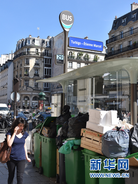 6月9日,一名行人经过堆满垃圾的公交车站。环卫工人的罢工导致巴黎一些街区垃圾大量堆积。新华社记者李根兴摄