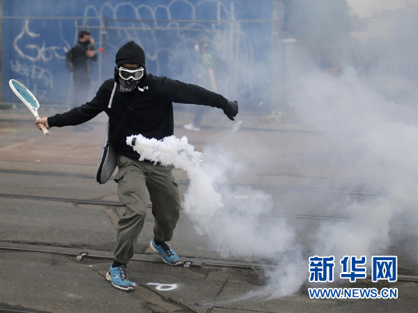 6月2日,在法国西部城市南特,一名抗议者准备用球拍击打警方投掷的催泪弹。新华社发
