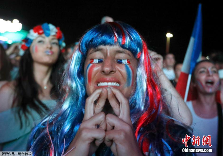 一名法国女球迷正在经历紧张时刻,她的手势仿佛是在行使某种神秘的法术,为自己的球队助力。