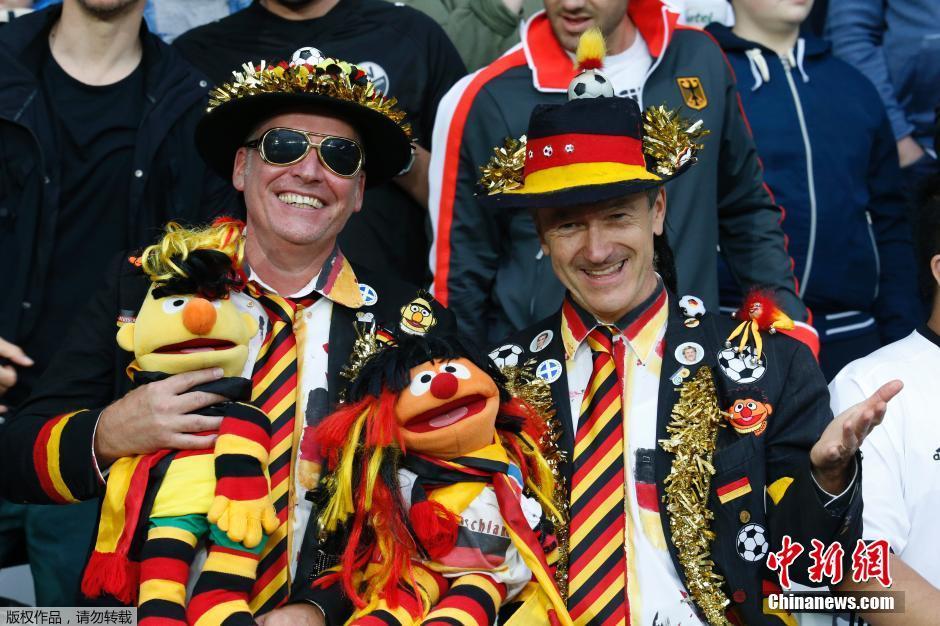 两名德国球迷盛装打扮,来到德国与乌克兰的比赛现场。