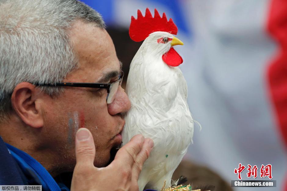 一名法国球迷亲吻手中的吉祥物——一只高卢雄鸡玩偶。