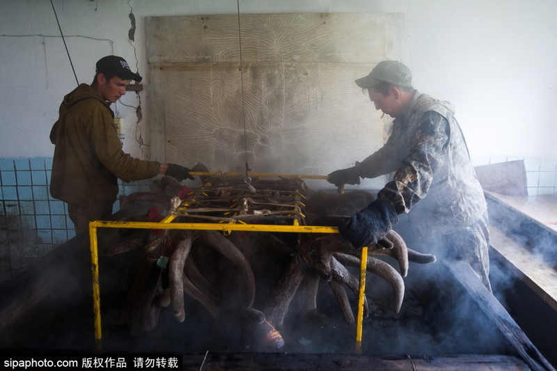 俄罗斯阿尔泰共和国,Ongudaysky区的Tenginsky饲养厂,工作人员挑选好的鹿角切下,从中提取鹿茸精和生物复合物等。Sipaphoto
