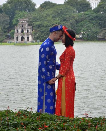 在越南首都河内,一对身着奥黛的情侣在拍婚纱照。(新华社记者闫建华摄)