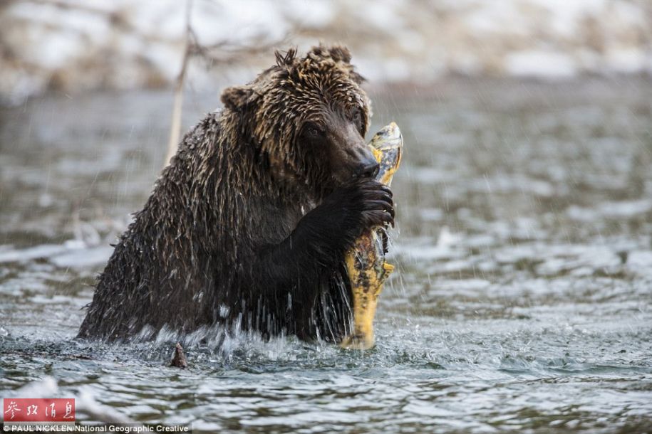 随着森林砍伐越来越严重,冰川融化摧毁了它们的的自然栖息地,人们应该知道当它们在崎岖荒野里出现时并不是灾难而是是一个健康生态信号的积极信号。图为一只灰熊在吃鲑鱼。