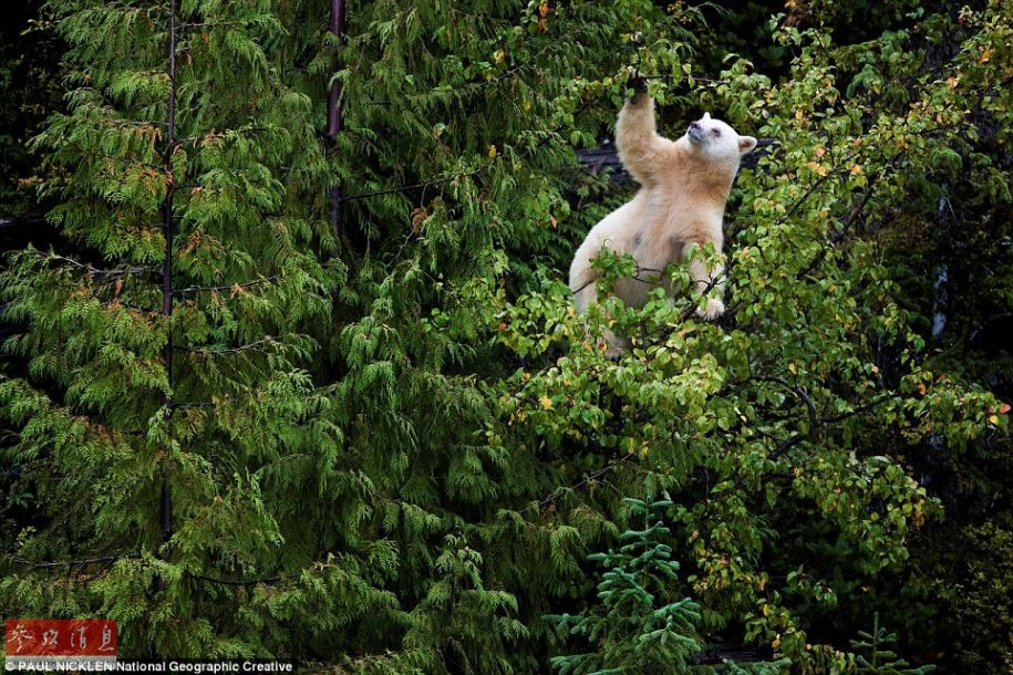 由于生态环境的恶化,熊的栖息地不得不转移。图为一只科默德熊在爬到树上采摘果实。