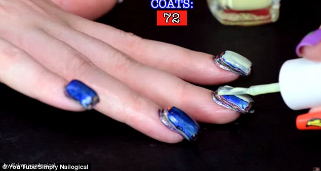 等每一层都彻底干透会花掉更长的时间,所以到下午2点26分时,克莉丝汀才完成到第16层。短暂的午餐之后,她继续辛勤工作。直到晚上11点38分,克莉丝汀终于大功告成,完成了她的第116层指甲油。她很开心,并给这次的创作命名为“甲油山”。