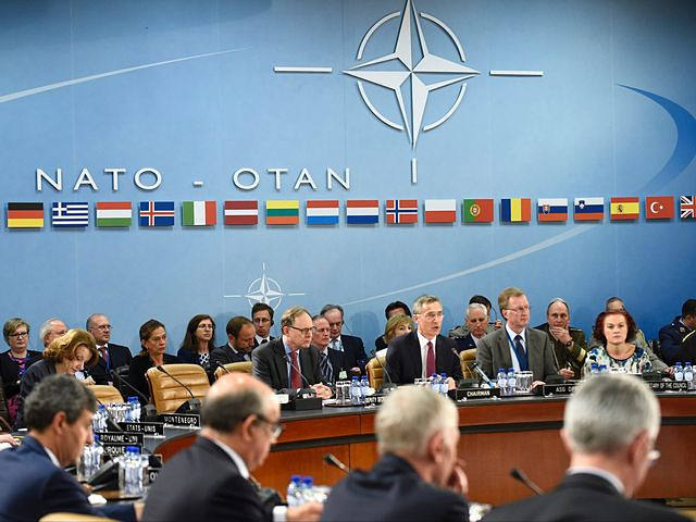 北约国防部长会议在比利时首都布鲁塞尔举行,北约秘书长斯托尔滕贝格(中)在会议中发表讲话。(图片来源:新华/法新)