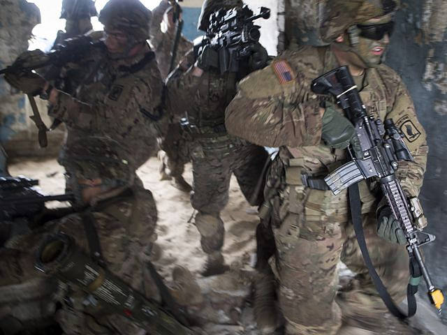 6月15日,代号“铁狼2016”演习在立陶宛首都维尔纽斯以西举行,图为美军空降兵突入一栋建筑。(图片来源:新华/美联)