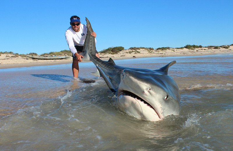 乔什 巴特沃斯和杰思罗使用皮艇将饵线布置到距离海岸约100米的地方,并用黄貂鱼、鱼骨和头为诱饵以诱惑虎鲨靠近海岸。他们不使用任何机械设备来捕鱼,一旦虎鲨们靠近诱饵并上钩,他们就使用蛮力拖拽虎鲨,将它们拉到沙滩上。