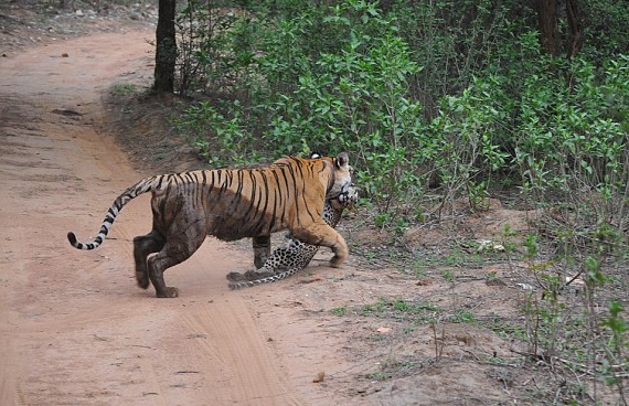 母老虎在丛林中捕食豹子 场面惊险(组图)