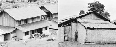 由中国电建集团老挝南欧江流域发电有限公司建设的老挝琅勃拉邦省孟威县帕景村新移民村建筑(左),极大改善了当地村民生活居住环境。右图为搬迁前的旧房子。
