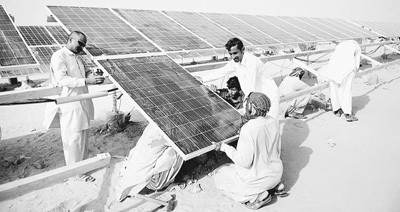 2015年8月27日,在巴基斯坦旁遮普省巴哈瓦尔布尔地区,当地工人在中兴能源900兆瓦光伏地面电站安装太阳能电池板。该电站总投资额逾15亿美元,是中巴经济走廊的优先实施项目之一。新华社发