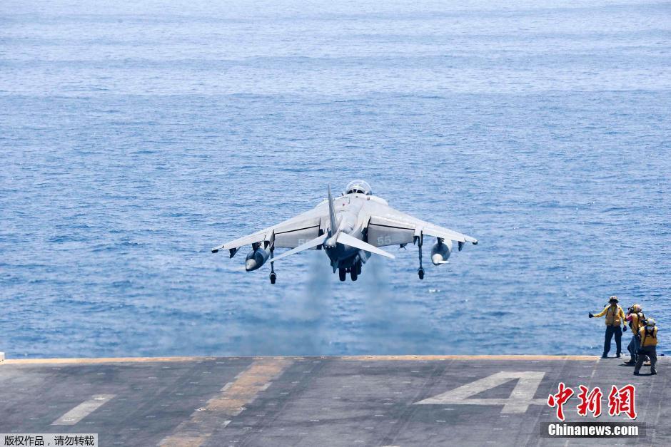 当地时间6月16日,巴林王国麦纳麦,美国海军陆战队装备的AV-8B鹞式战机将从两栖攻击舰“拳师”上起飞前往伊拉克打击极端组织。